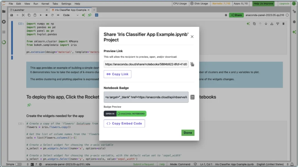 Notebooks puts one of the most popular integrated development environments, JupyterLab, into a cloud-based environment that only requires you to have an anaconda.cloud account. From there, you can write, edit, and run Python code. You can also share their findings — either through a URL that lets others click and start working on a copy of the notebook, or by building a Panel App that is deployed to the web so that anyone can access it.
