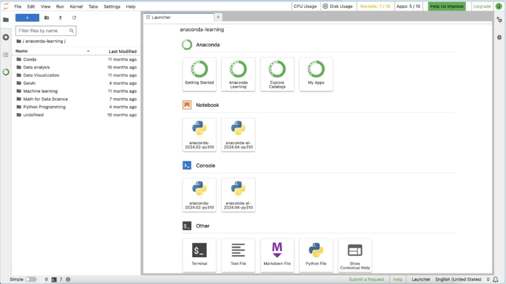 Two preconfigured environments are available: one contains the latest Anaconda Distribution of packages, while the other adds packages that are specifically chosen to enable AI workflows.