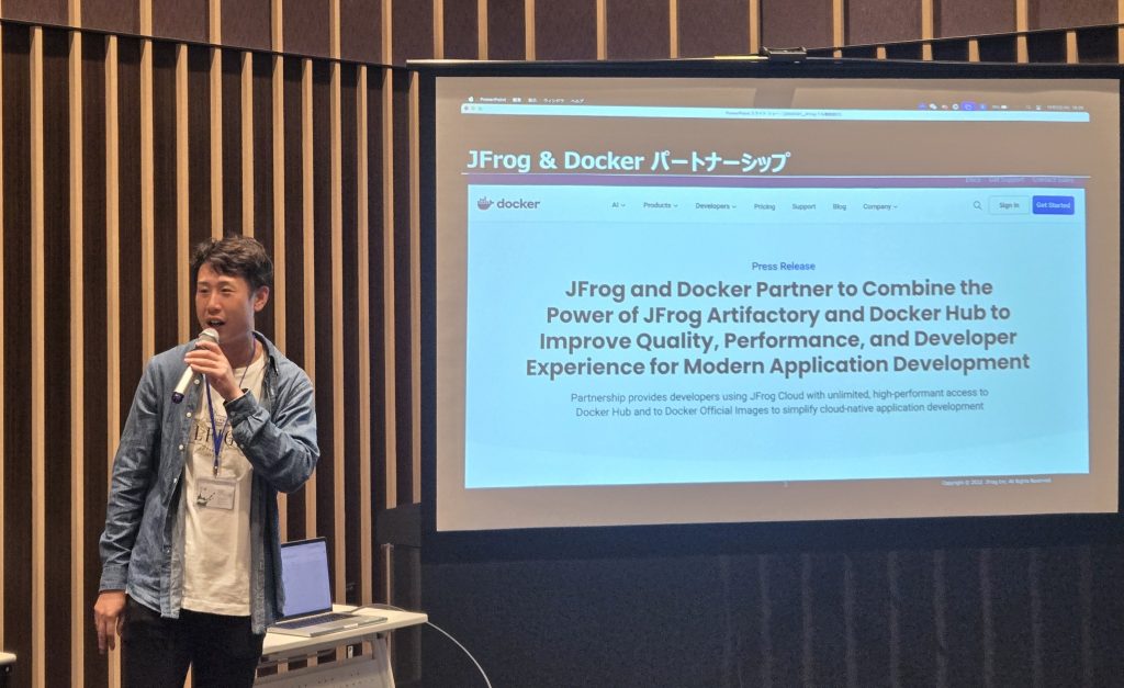 Docker 社のパートナーであり、弊社が日本正規代理店を務めている製品「JFrog Platform」について、JFrog 社の Alex 様にお越しいただき、製品をご紹介いただきました。