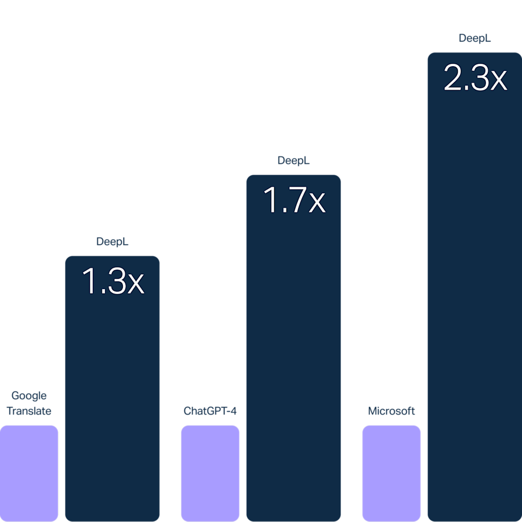 DeepL 社が提供する最新の次世代言語モデルは、言語処理に特化して設計・最適化された自社開発の高度な LLM 技術を基盤としています。この最新技術は、高品質な翻訳や大規模なコンテンツの最適化を求めるチームにとって新たな基準を打ち出し、精度の向上と誤訳の削減を実現しています。