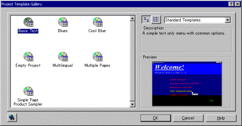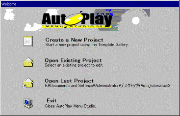 1. AutoPlay Media Studio 4.0 を起動します。 2. 体験版の確認画面で、[OK] を選択します。 3. [Top of the day] のダイアログを閉じます。 4. [Create a New Project] をクリックし、テンプレート選択画面を呼び出します。