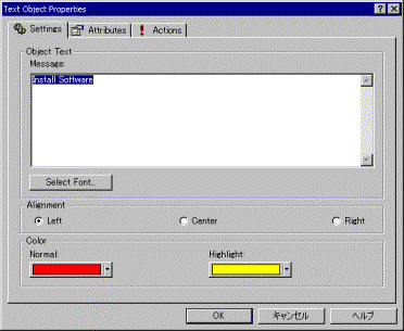 6. Text Object [Install Software] を選択し、メニューから [Object] – [Propaties] を選択します。 [Text Object Propaties] ダイアログが表示されます。