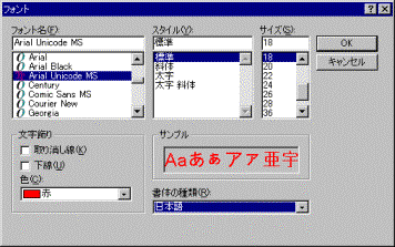 8. [Select Font…] ボタンをクリックして、フォント選択ダイアログを表示します。 9. フォント名 リストから [Arial Unicode MS] を選択し、書体の種類 ドロップダウン リストから [日本語] を選択します。