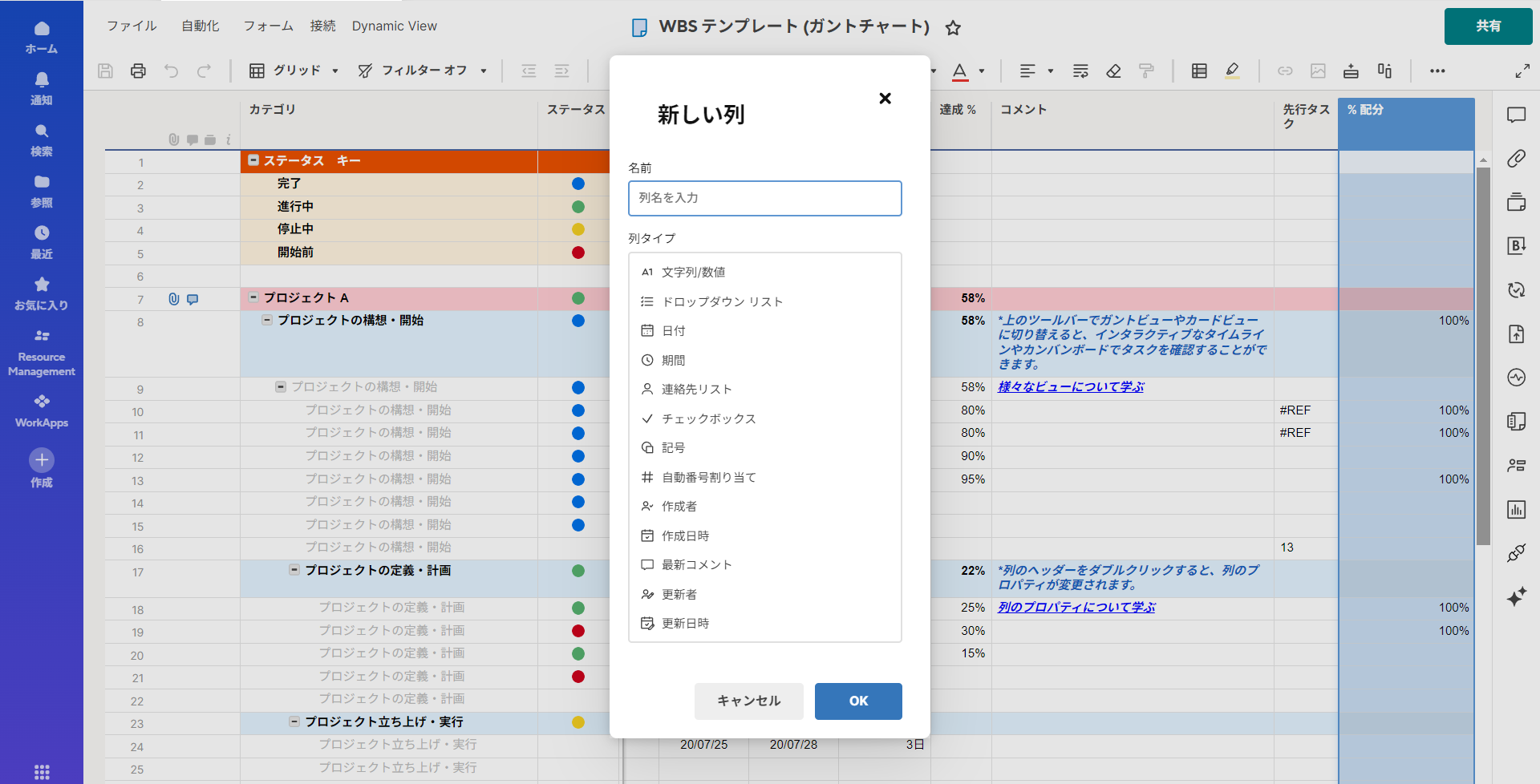 プロジェクトを作成し、ガント チャート機能を有効にするために必要な共通の列が含まれています。 |