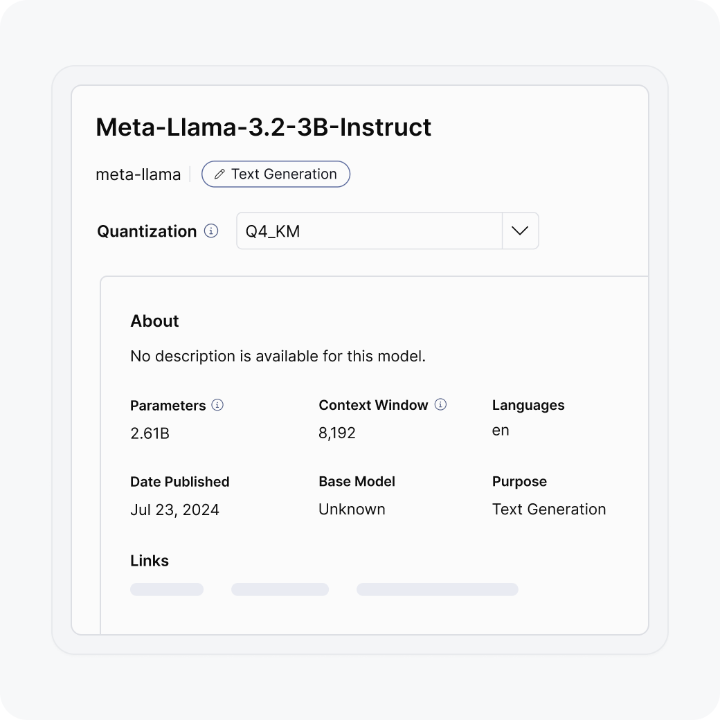 Skip weeks of researching AI models across open source libraries. Compare benchmarked models, then deploy to your private cloud with GPU autoscaling or run locally on your desktop using the same secure API interface. Our optimization pipeline validates every model, so you can move from prototype to production faster.