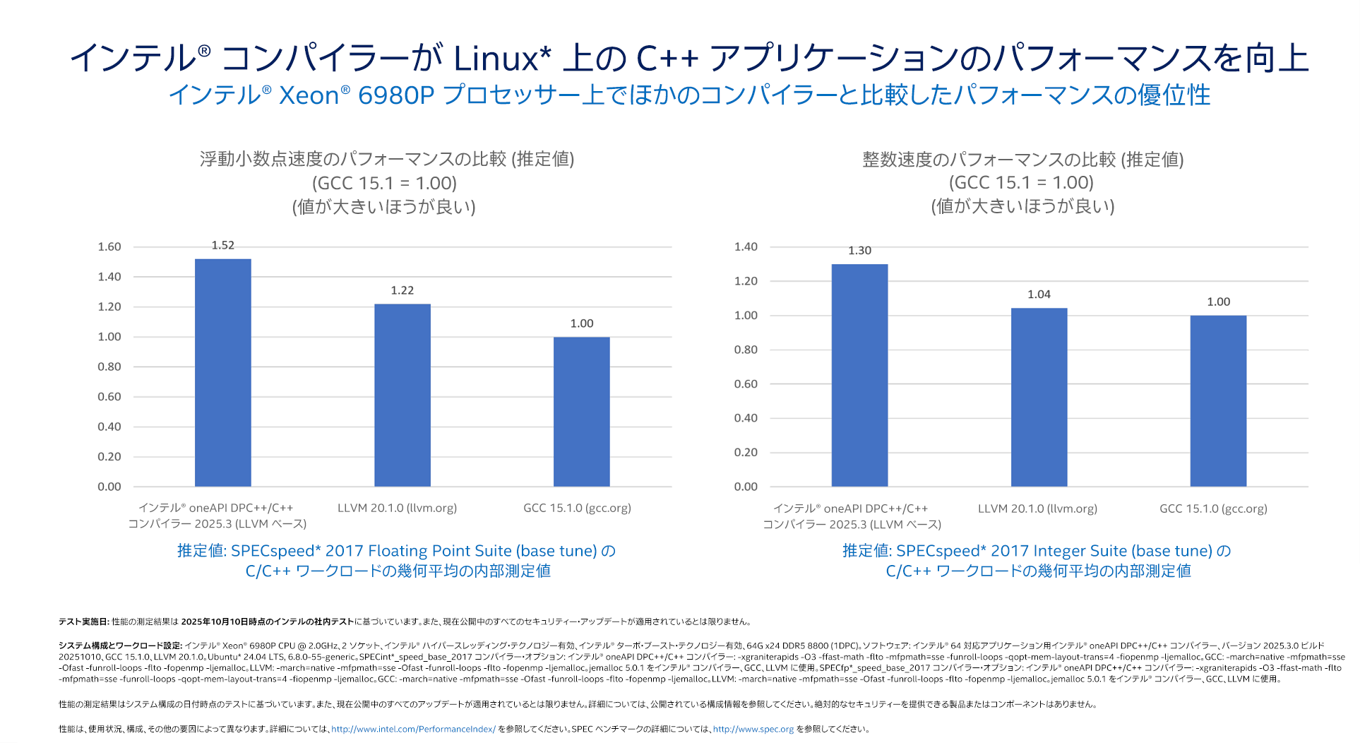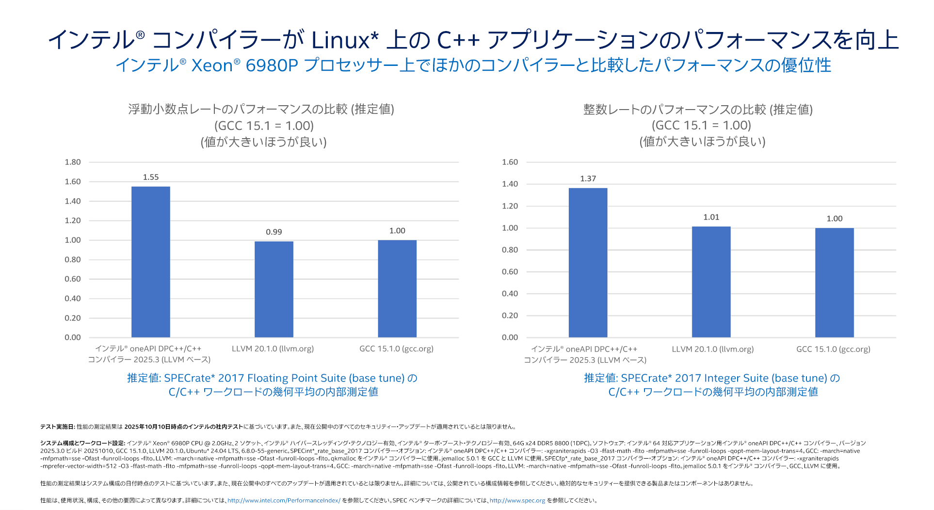 開発元であるインテル社の方針により、2023年後半の oneAPI リリースでインテル® C++ コンパイラー・クラシック (icc) の提供終了が予定されています。今後も Windows* および Linux* サポート、新しい言語サポート、新しい言語機能、最適化をご利用いただくために、LLVM ベースのインテル® oneAPI DPC++/C++ コンパイラー (icx) へ移行することを推奨しています。