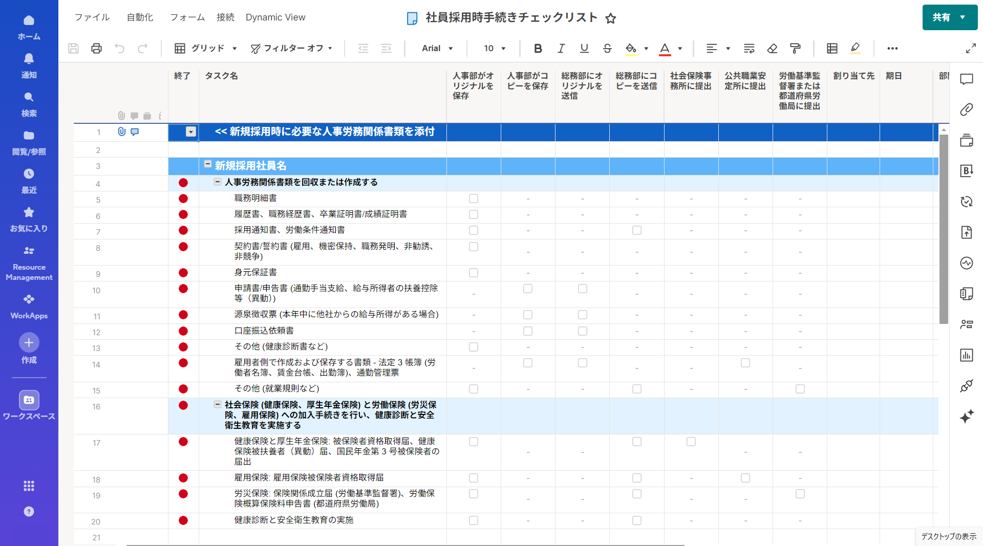 入社手続きや初期研修のタスクをテンプレート化し、各新入社員ごとに進捗を管理できます。関係部署への自動通知で連携ミスを防ぎ、スムーズな受け入れが可能です。